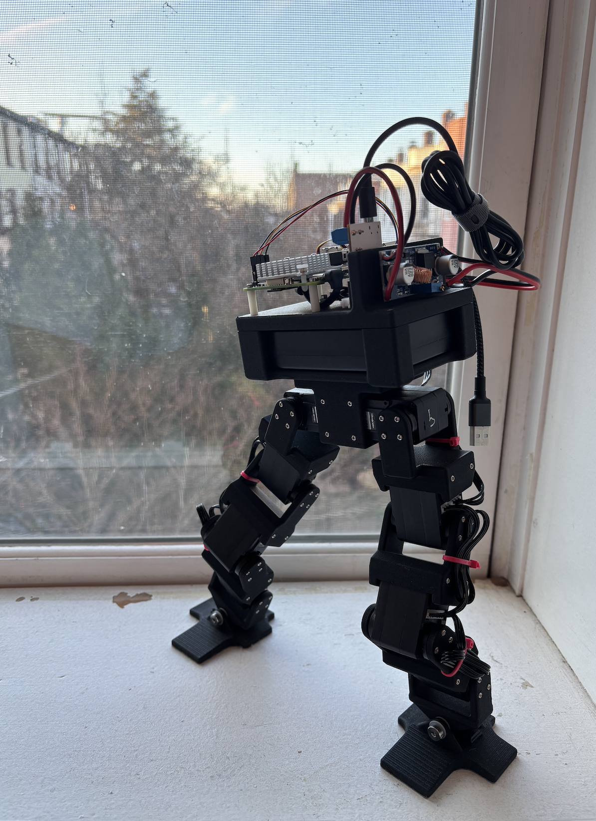 Given fixed design constraints: eight servo motors, a DC power converter, battery, IMU, and a Raspberry Pi, I was tasked with designing a robot capable of stable walking.