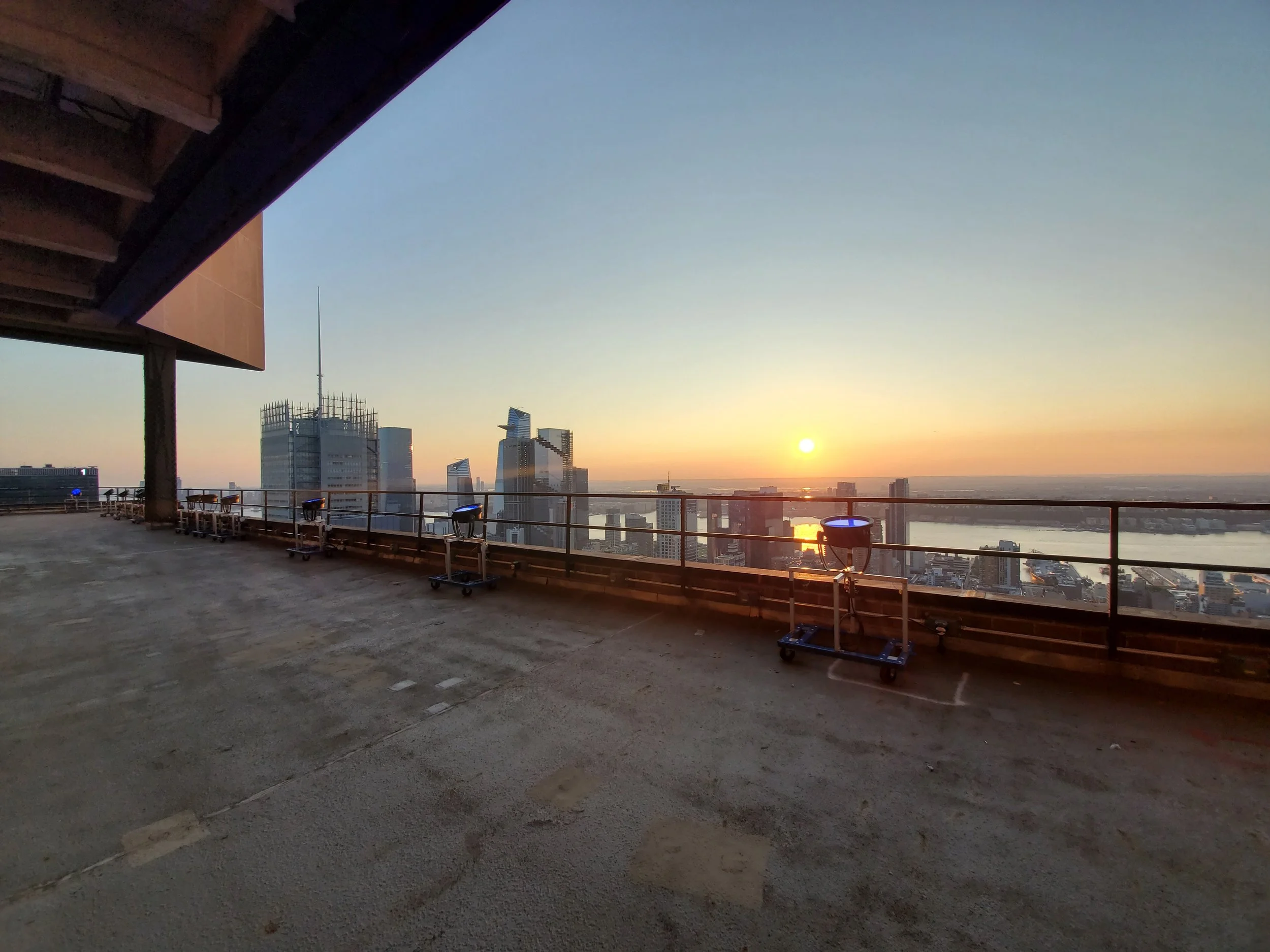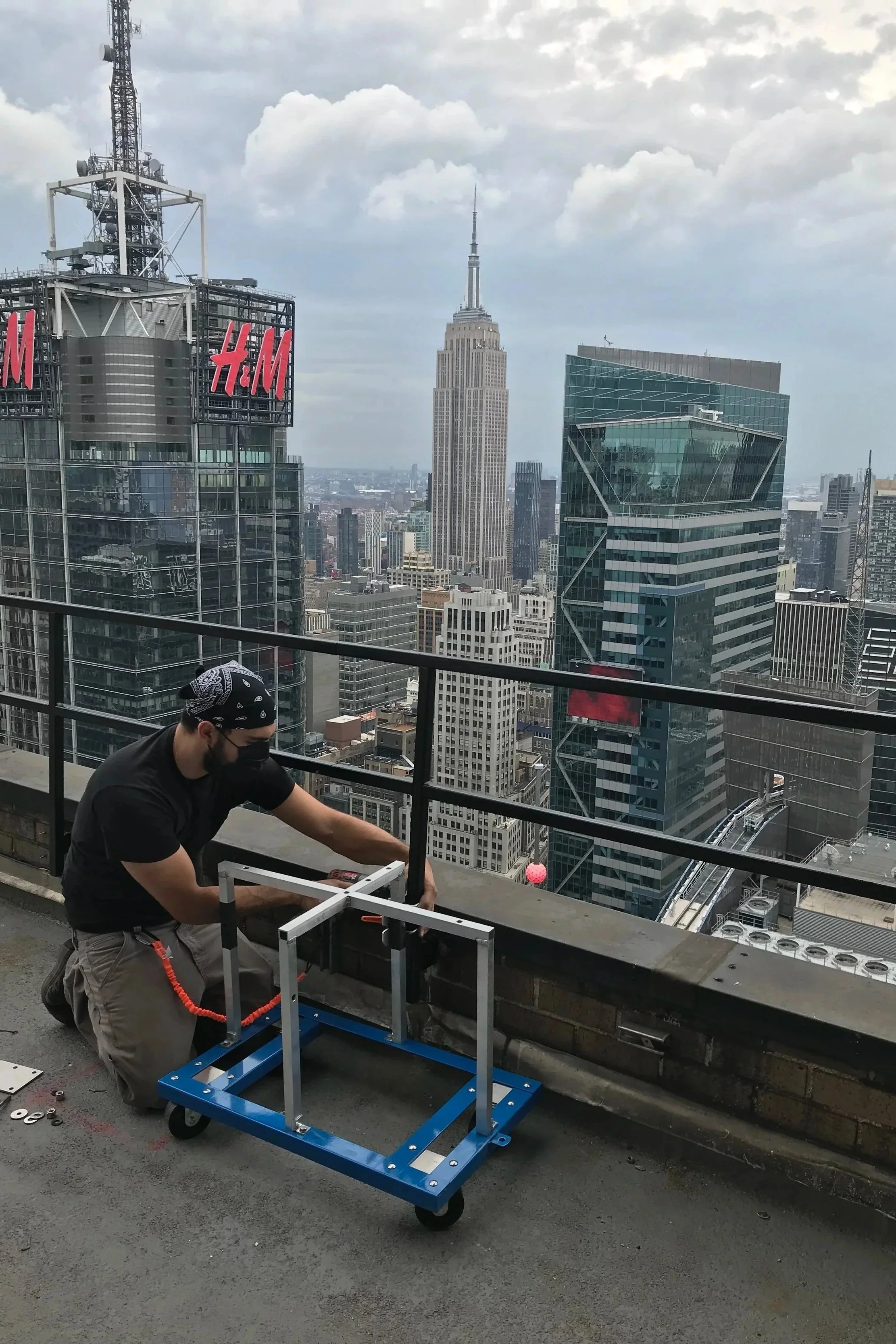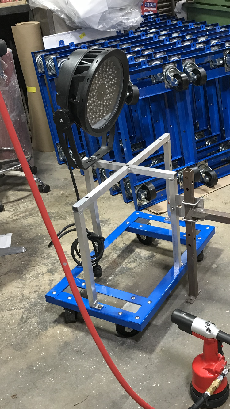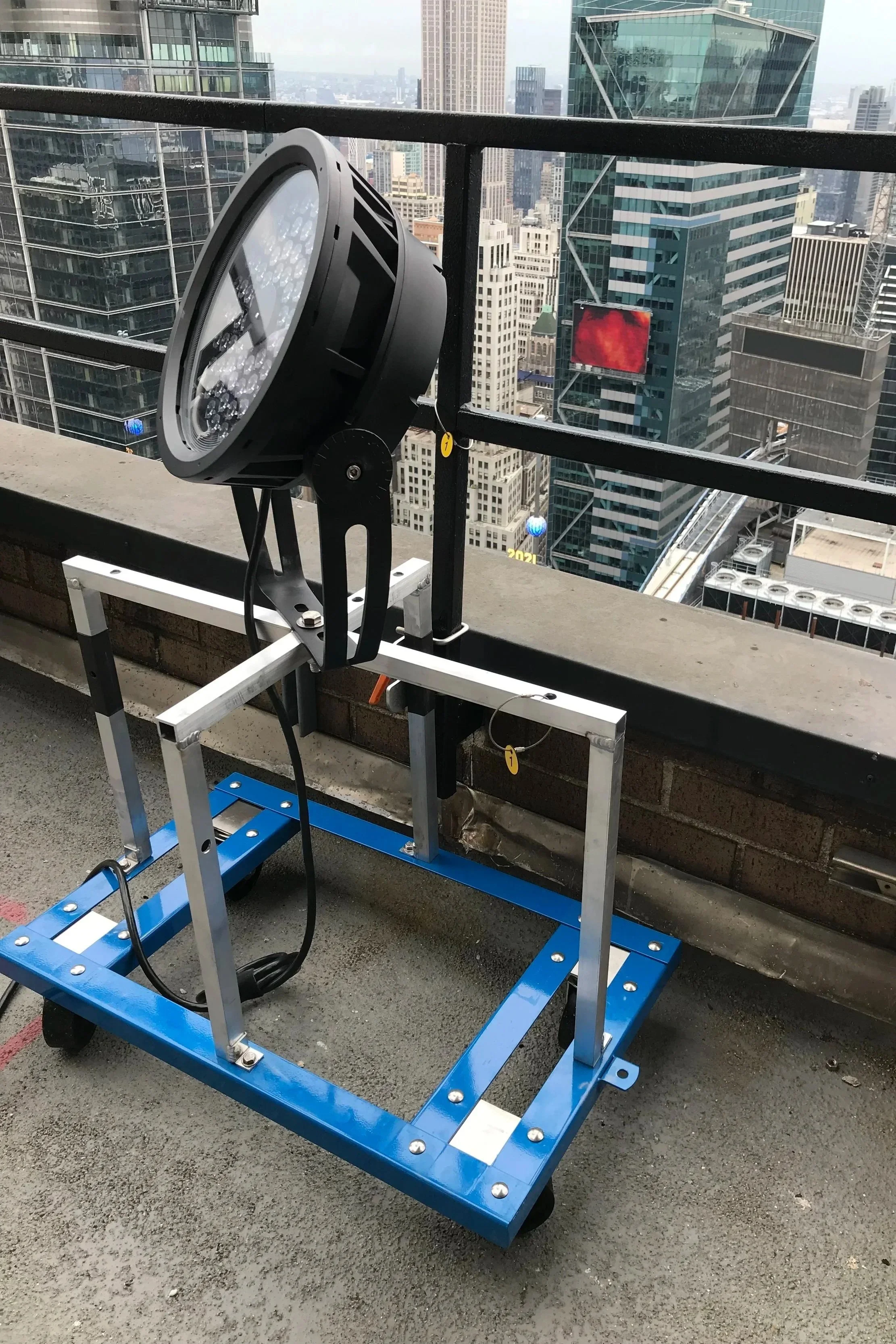 Lighting bracket dollies designed and fabricated to hold Lumenpulse spot lights to provide decorative uplighting on a times square building rooftop in NYC.