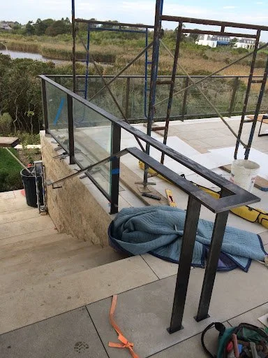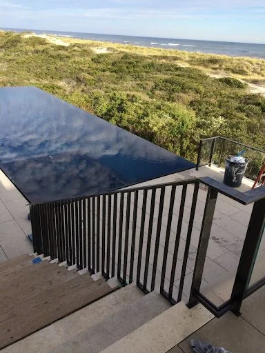 Hand railing assemblies fabricated with 304 stainless steel bar stock. All joining hardware was cnc machined for a non welding on site installation. Pieces are finished in a black oxide patina.