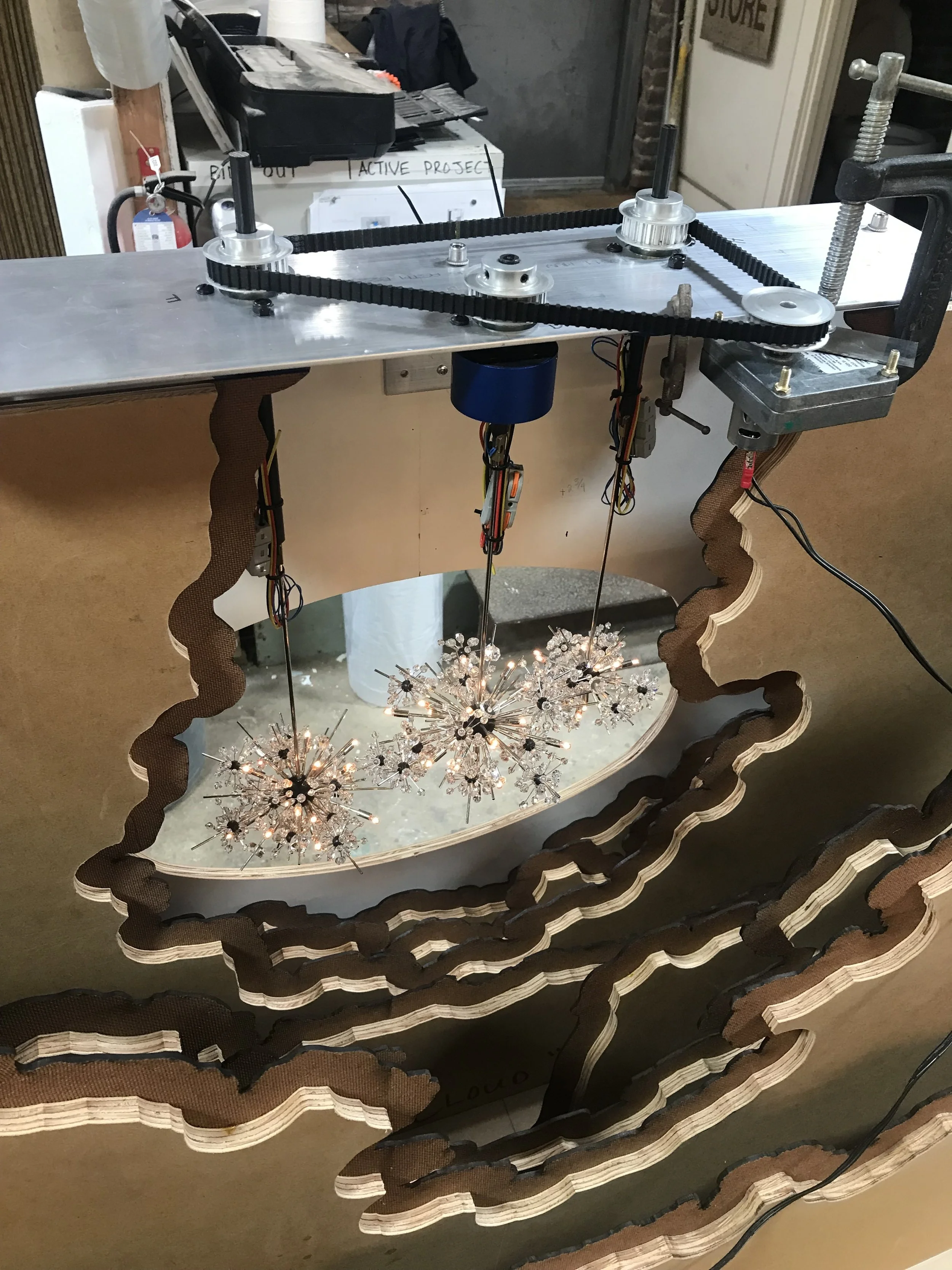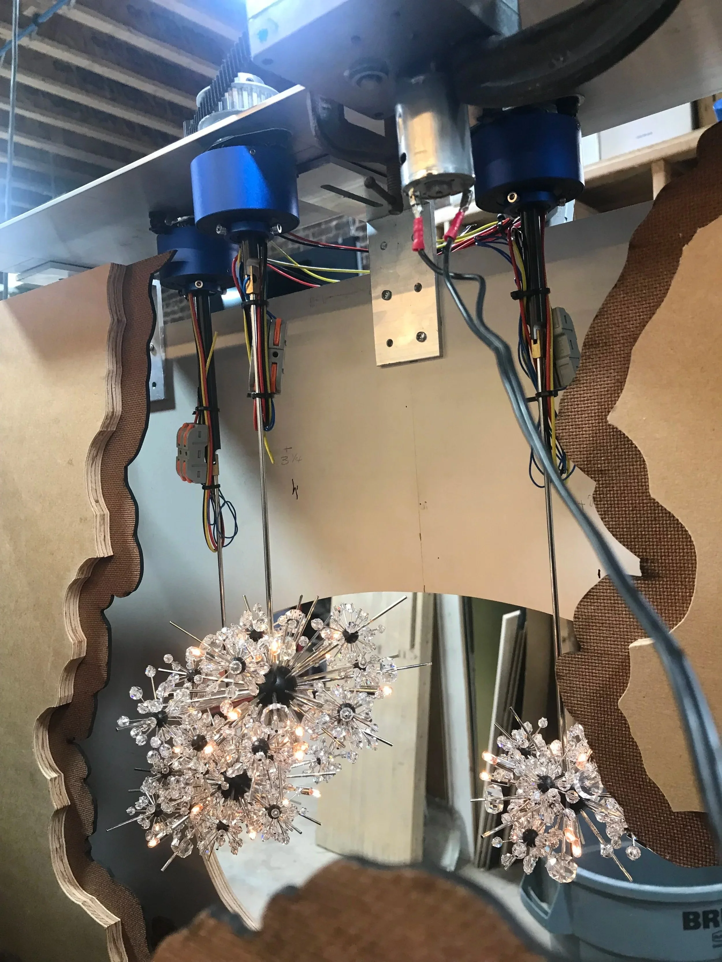 To enable infinite rotation without wire interference, we integrated a hollow slip-ring rotary assembly. This design allowed the chandelier to be wired through a rotating subassembly while maintaining a fixed electrical hub for the main power connection, ensuring reliable power delivery during continuous motion.